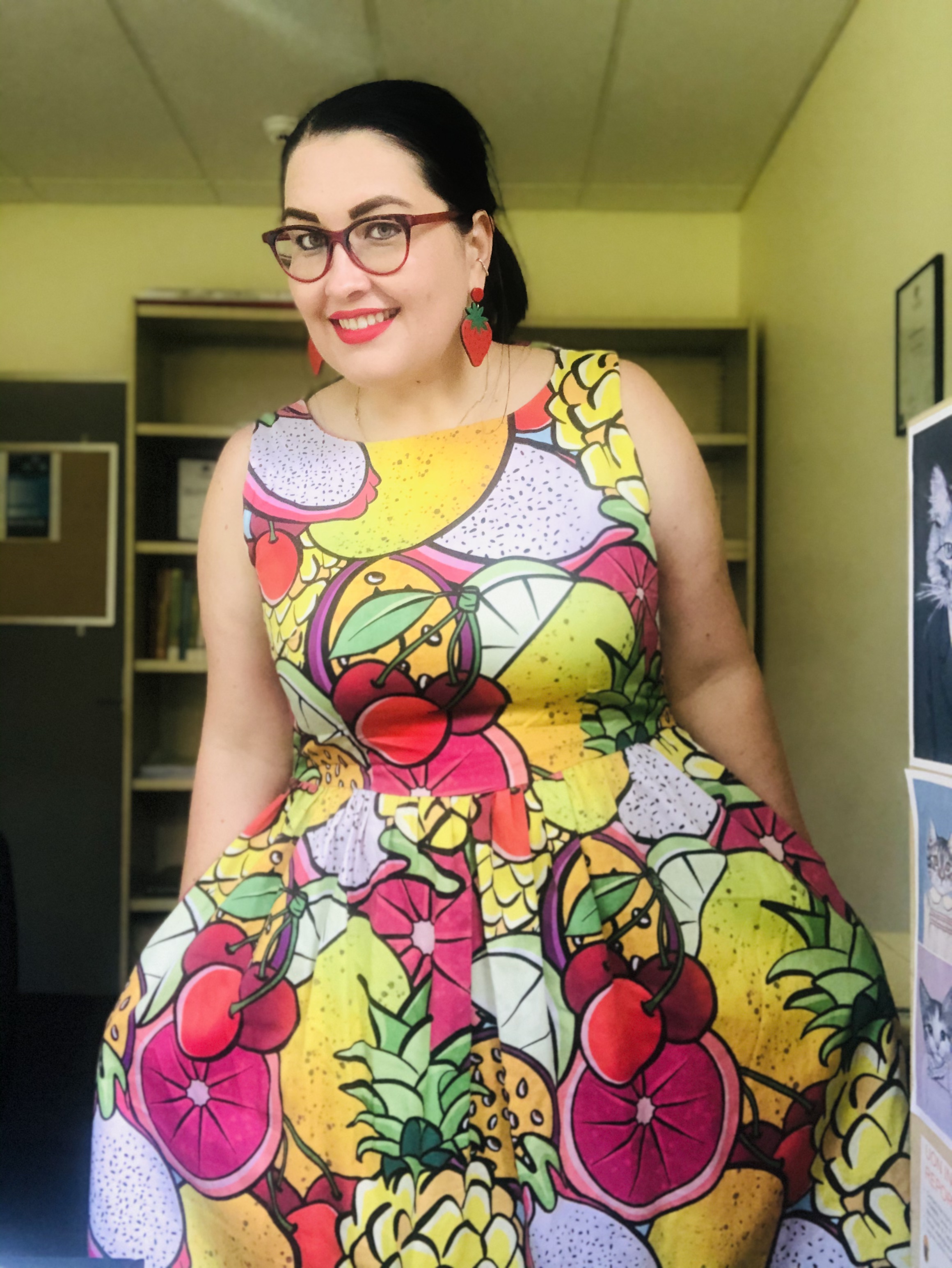 Around the same time, I got some food-print dresses. I hadn’t originally purchased them because they were food, but because they were loud and bright and fun. They made me happy, and it turns out they make other people happy. Online, at conferences, at work, in meetings, random people in the street… they started conversations and made people smile. I realised they were the ultimate icebreaker. I can wear my fruit salad dress and talk about fruit intake recommendations, or my veggie dress and talk about ways of adding veggies to your diet, or my chocolate desserts dress can start a conversation about guilt and junk foods.